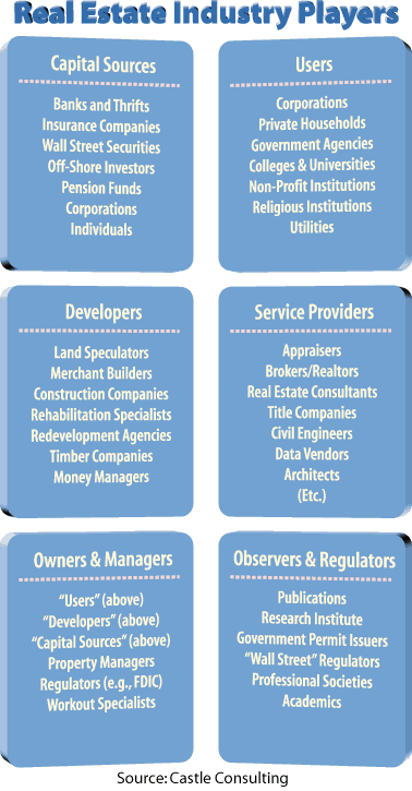 | 1. | The industry is huge. More than half the world's wealth is in real estate. More than one-fourth of the Gross National Product of the United States derives directly from real estate. Three-fourths of the 400 largest personal fortunes in the United States are based on real estate. After payroll, real estate is the largest budgetary item for most private sector and public sector organizations, etc. |